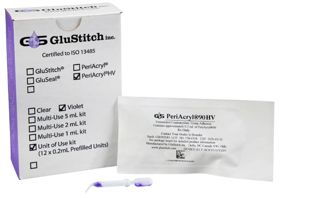 GluStitch designed PeriAcryl®90 High Viscosity, a thicker formulation to provide more control during application. This new product is 9 times thicker than the original PeriAcryl®90 formulation and has the same strength and durability characteristics that specialists have come to rely on. Both PeriAcryl®90 and PeriAcryl®90 High Viscosity are now available for sale world-wide.